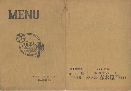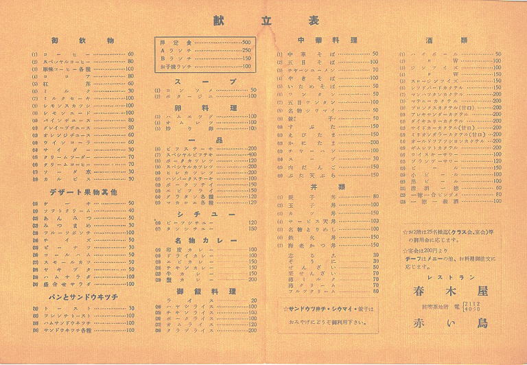 ↓は、当時のメニューの表紙と内容です。 (メニューの内容写真は、見やすくするためおおきくして、コントラストを上げています、実物は表紙の色と同じです。) 「名物カレー」の下に「印度カレー・・・100」と書かれているのが現在の「黒カレー」」のルーツです。コーヒーが60円。商品の値段や電話番号が4ケタしか無いのが時代をものがたっていますね。 NEXT・8 RETUN・6 TOP